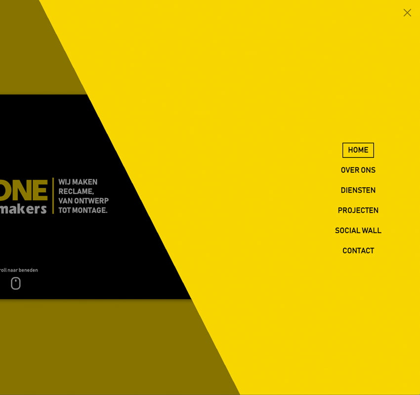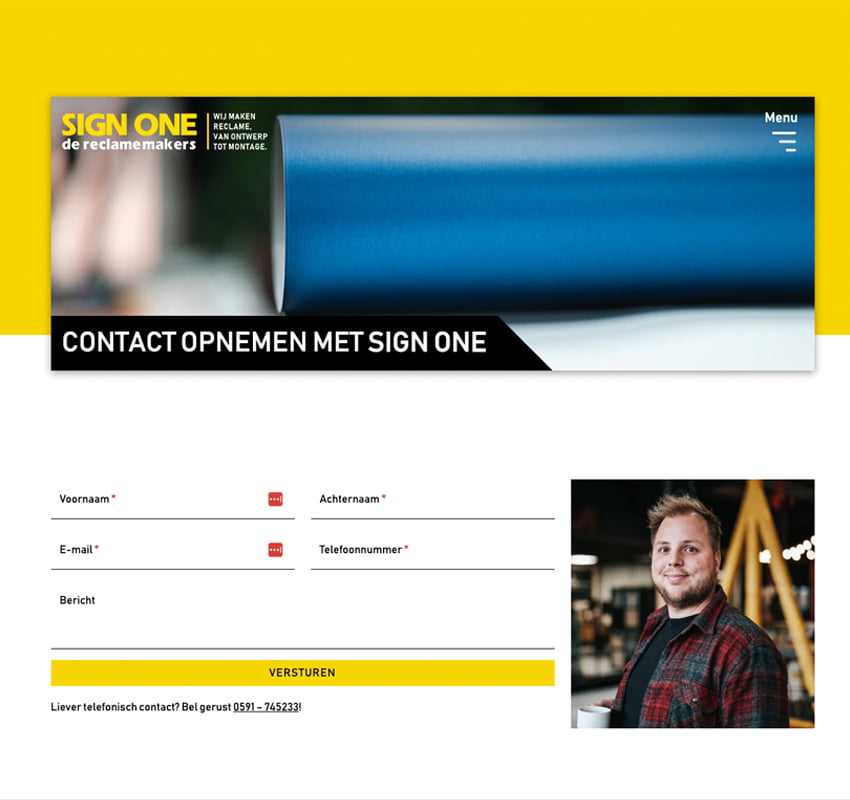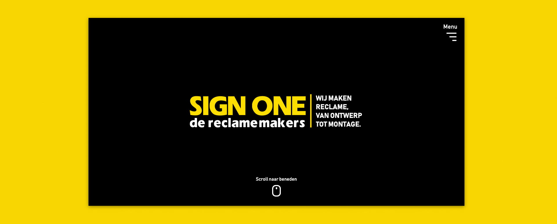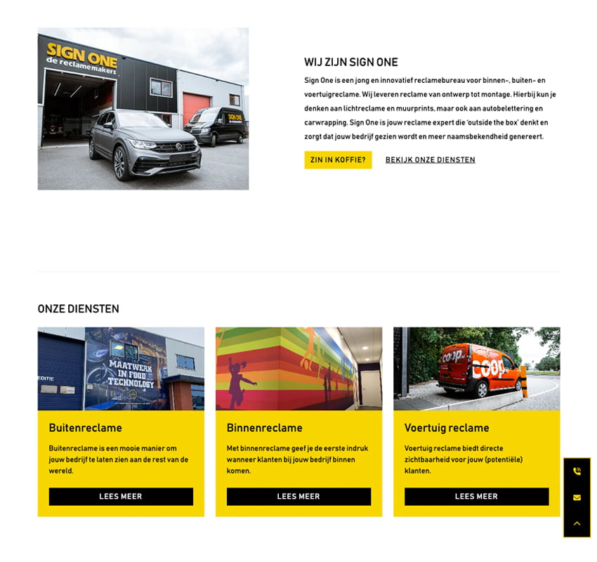 Kom je uit Emmen, dan moet je de bus een keer hebben zien rijden. Sign One zijn reclame makers, van ontwerp tot montage. Hun bussen zijn dan ook rijdende reclame borden. Zwart met grote gele letters, niet te missen. Dat is wat je wilt met reclame, het mag niet te missen zijn. Dat wilden we ook terug laten komen in het ontwerp van de website.